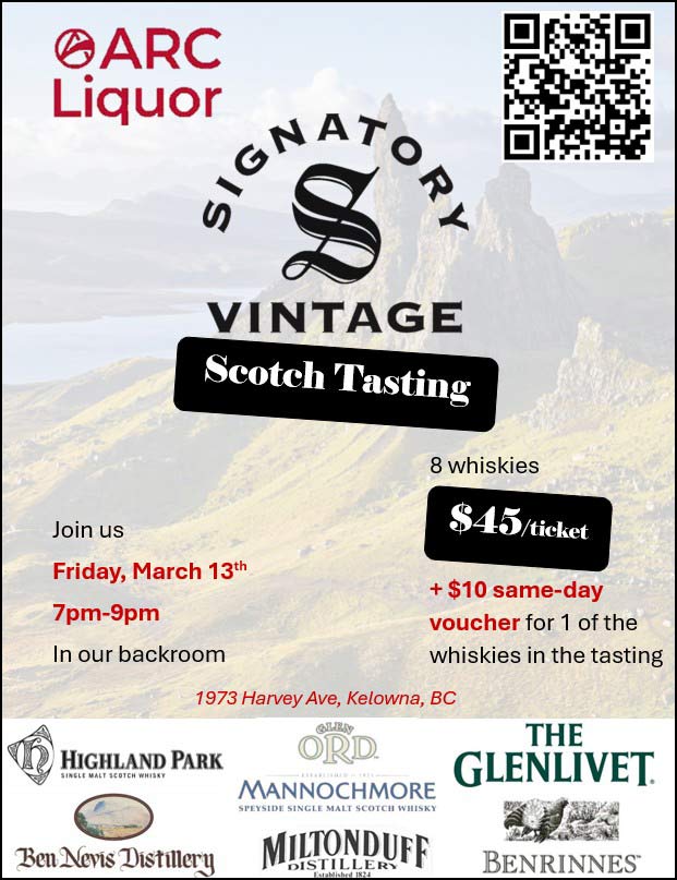 Join us at ARC Liquor Harvey/Spall for a night of Signatory Vintage Scotch tasting hosted by JP Savoie. Signatory Vintage is amongst the best independent bottlers in Scotland. We will be sampling 8 different scotches from Signatory, from distilleries such as Glenlivet, Highland Park, Ben Nevis, Benrinnes, Glen Ord, Miltonduff, and Mannochmore.