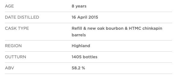 Aged 8 years in a combination of refill & new oak bourbon barrels and HTMC Chinquapin barrels, this Highland dram is a delicious experiment gone very, very right.
